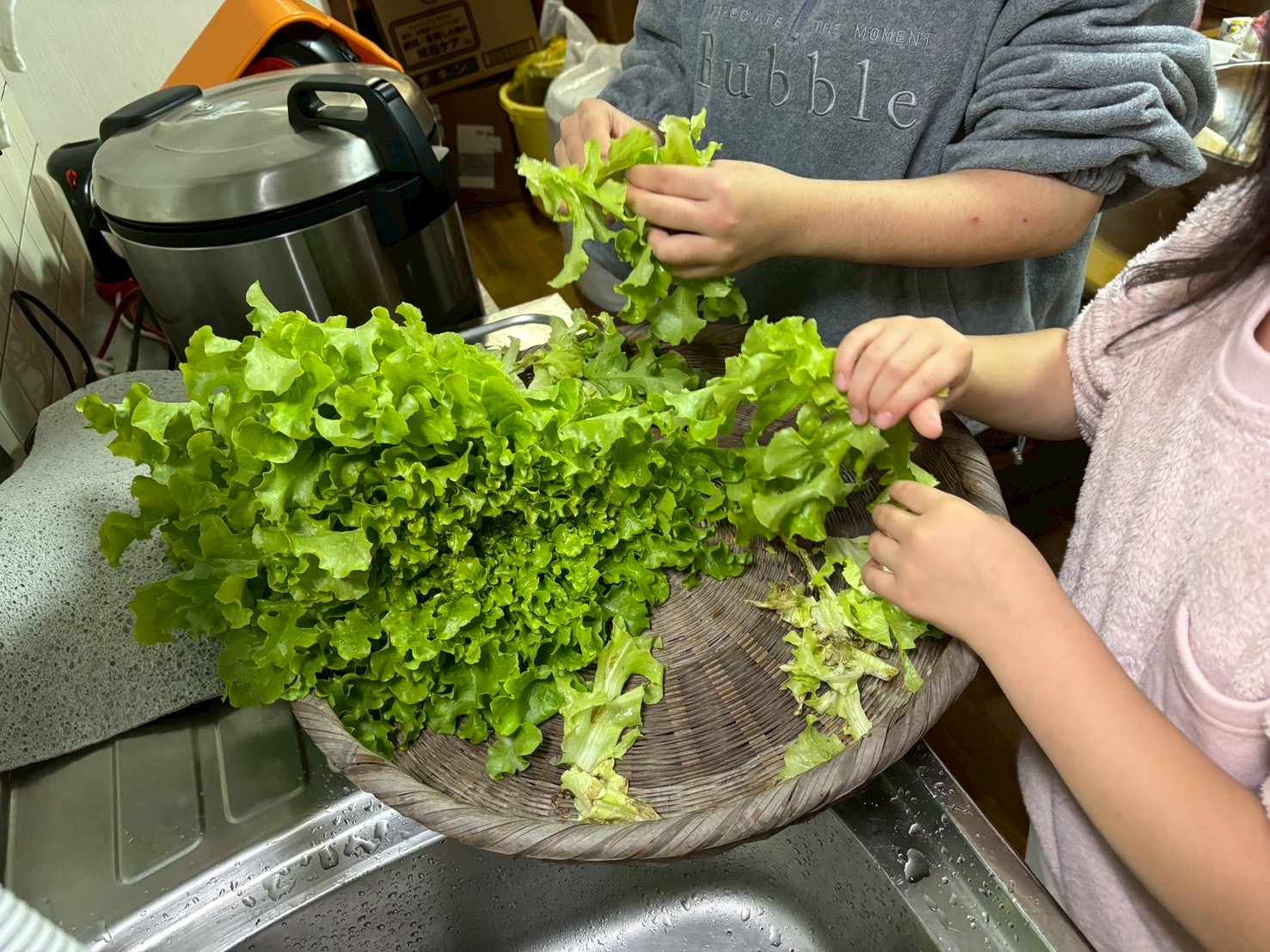 *畑で採ってきたレタスはすぐに完食!新鮮さが食を刺激します。