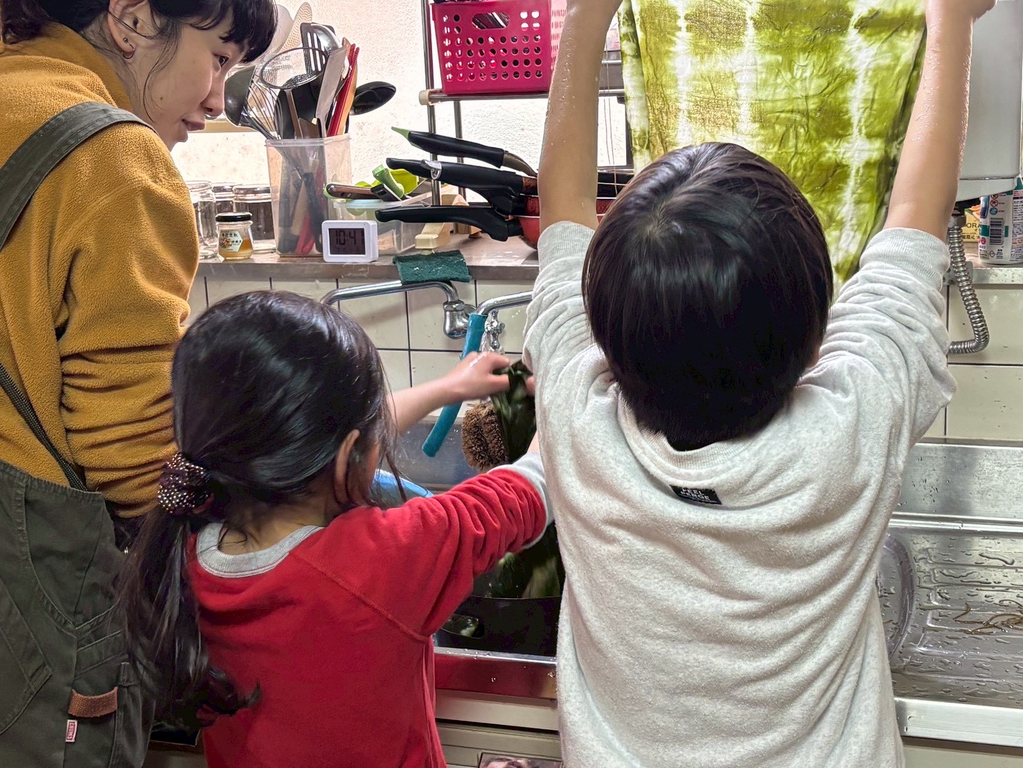 染めたものを洗う子どもたち。染め上がりに満足そう。