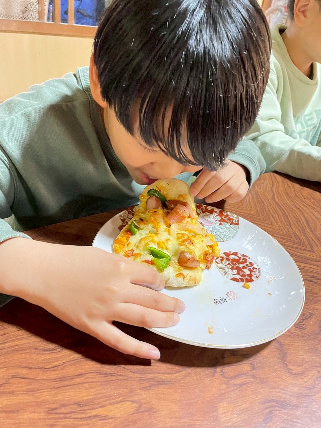 焼きたてのピザをほおばる子ども。